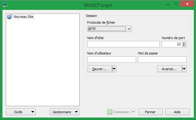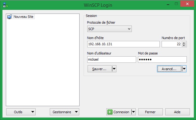 Ici, on retrouve une configuration un peu comme celle de Putty sous Windows, on peut y spécifier l’IP ou le nom de notre serveur cible, son port, le nom d’utilisateur et son mot de passe. Vous retrouverez également en haut le champ » Protocole de fichier ». En effet, WinSCP permet de gérer les transferts en SCP, mais également en SFTP (que nous verrons juste après) et en FTP, dans cette liste de sélection, choisissez donc « SCP » :