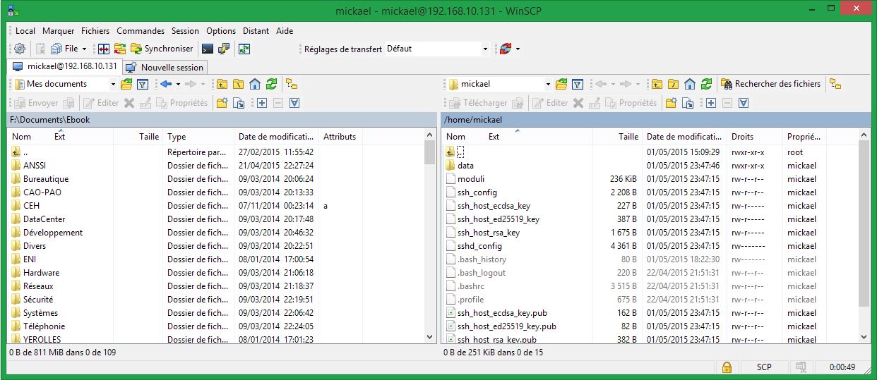 Ici, on peut apercevoir l’arborescence de mon client Windows à gauche, et l’arborescence de mon serveur Linux à droite, avec la possibilité de simplement glisser/coller des fichiers entre les deux, le tout de manière sécurisée grâce au SSH !